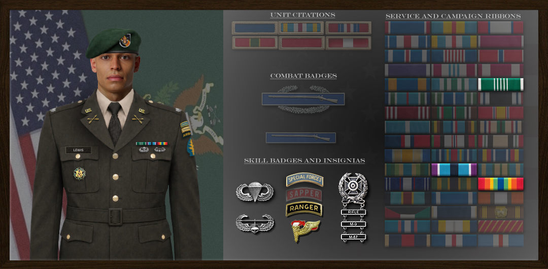 The Secretary of the Army has reposed special trust and confidence in your patriotism, valor, fidelity and professional excellence. In view of these qualities, your demonstrated leadership potential, and dedicated service to the United States Army and the 5th Special Forces Group, Jay Lewis is hereby awarded the Army Commendation Medal Awarded : Apr 1, 2026 Signed: Lieutenant Colonel Jay Lewis