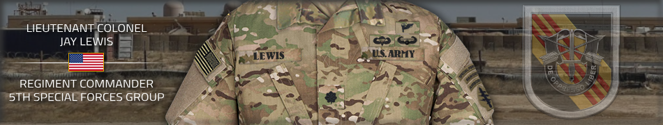 Special Forces Tab Awarded to: Jay Lewis To all who shall see these presents, greeting: This is to acknowledge that Lieutenant Colonel Jay Lewis has successfully completed and met all Department of the Army and 5th Special Forces Groups established training requirements for the qualification of Special Forces Tab Signed: Lieutenant Colonel Jay Lewis |